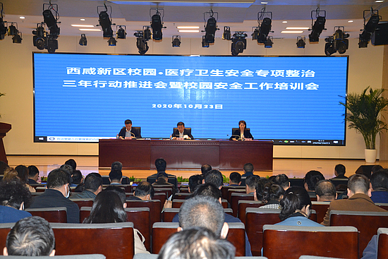 在校园、医疗卫生安全专项整治三年行动推进会上,新区公共卫生中心副主任孙豫炜对近期安全生产、信访维稳、扫黑除恶工作及校园、医疗卫生领域安全抽查情况进行了通报。沣西新城教育卫体局局长杨勇、沣东新城实验学校校长吕晓希分别作了交流发言。