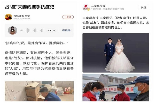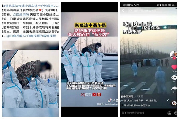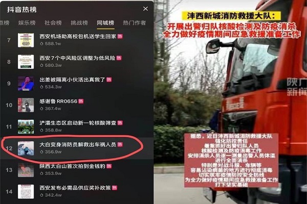 现场出警救援解民困。中国消防官方抖音号以《一群“大白”路遇车祸,现场出警》为题转发西咸消防抗“疫”途中紧急出警救援视频。在陕广新闻开展《西咸消防出警归队全面核酸检测和防疫消杀》直播,搜狐新闻、陕西都市快报分别报道《消防员抗疫途中遇车祸十分钟救出2人#竟是为隔离酒店送餐的志愿者》,话题“大白变身消防员解救出车祸人员”冲上当日抖音同城热搜TOP榜,获356.9万点赞量。