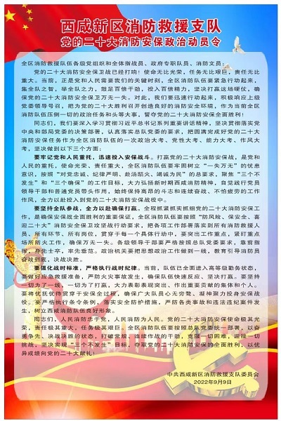 为进一步教育和动员全区消防救援队伍各级党组织和全体指战员凝聚奋发之力、展现奋战之举、激昂奋进之势,全力确保火灾形势和队伍安全稳定,9月9日,西咸消防支队党委发布政治动员令,号召全区消防救援队伍各级党组织和全体指战员决战决胜党的二十大消防安保,为党和人民再立新功。