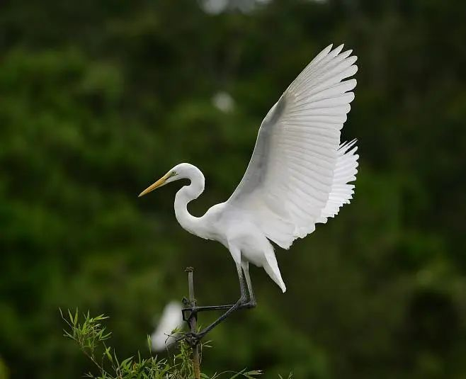 黄嘴白鹭,也叫白鹭,老、唐白鹭等,是一种中型涉禽,体长为46—65厘米,夏季嘴为橙黄色,脚为黑色,趾为黄色,眼先为蓝色;冬季嘴变为暗褐色,下嘴的基部呈黄色,眼先为黄绿色,脚也是黄绿色。