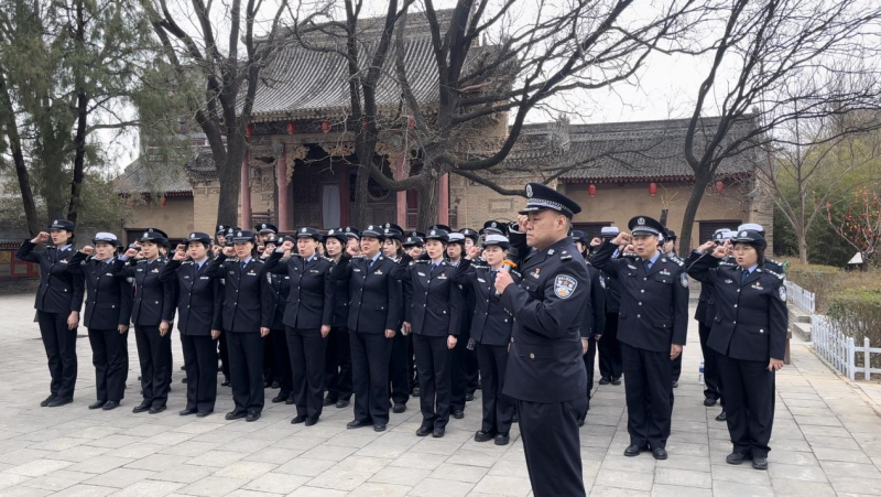 “我志愿加入中国共产党,拥护党的纲领……”在安吴青训班学员们上课的旧址,郭航书记带领党员民警,面对党旗,高举右拳,重温入党入警誓词。