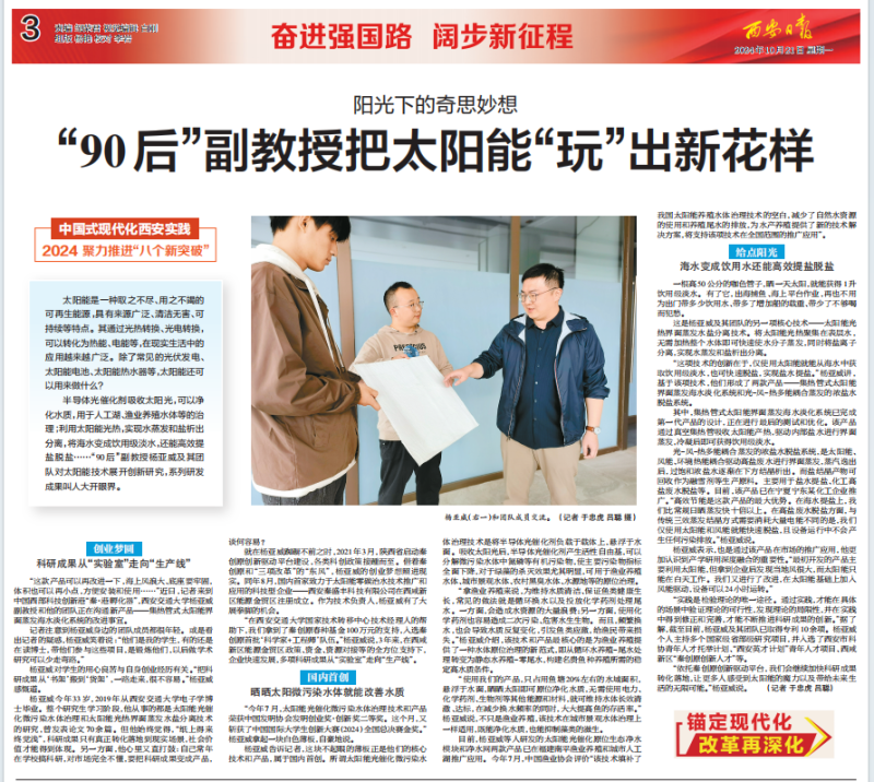 10月21日,《西安日报》以“阳光下的奇思妙想——‘90后’副教授把太阳能‘玩’出新花样”为题刊发报道,详细讲述了西安交通大学副教授杨亚威在能源金贸区创业成长的故事。