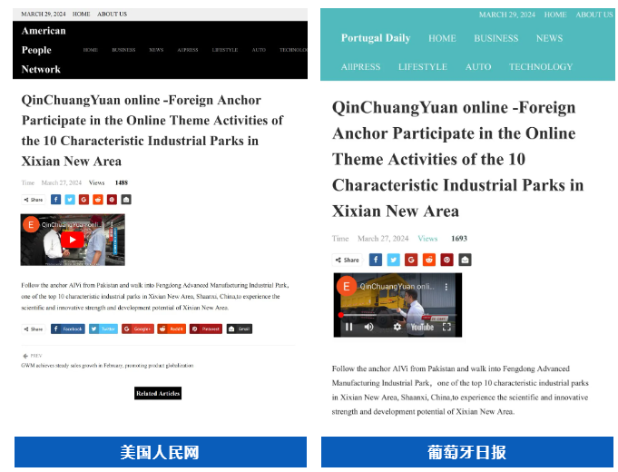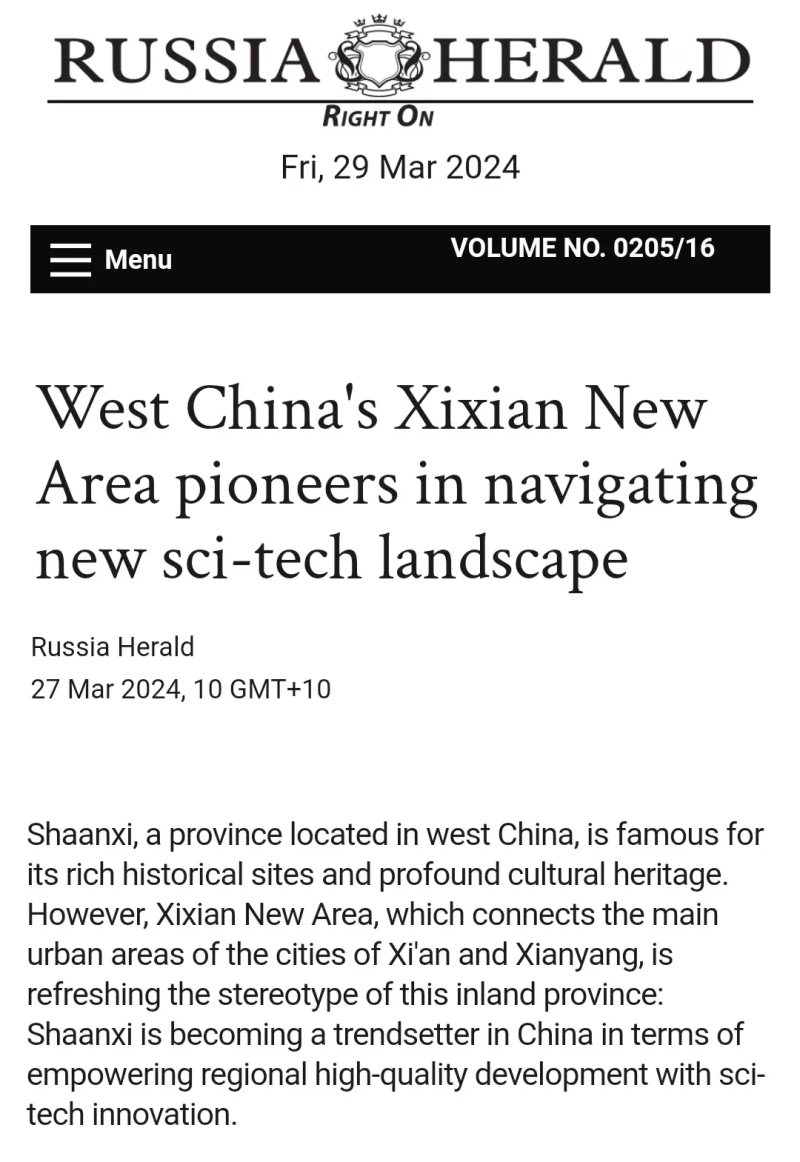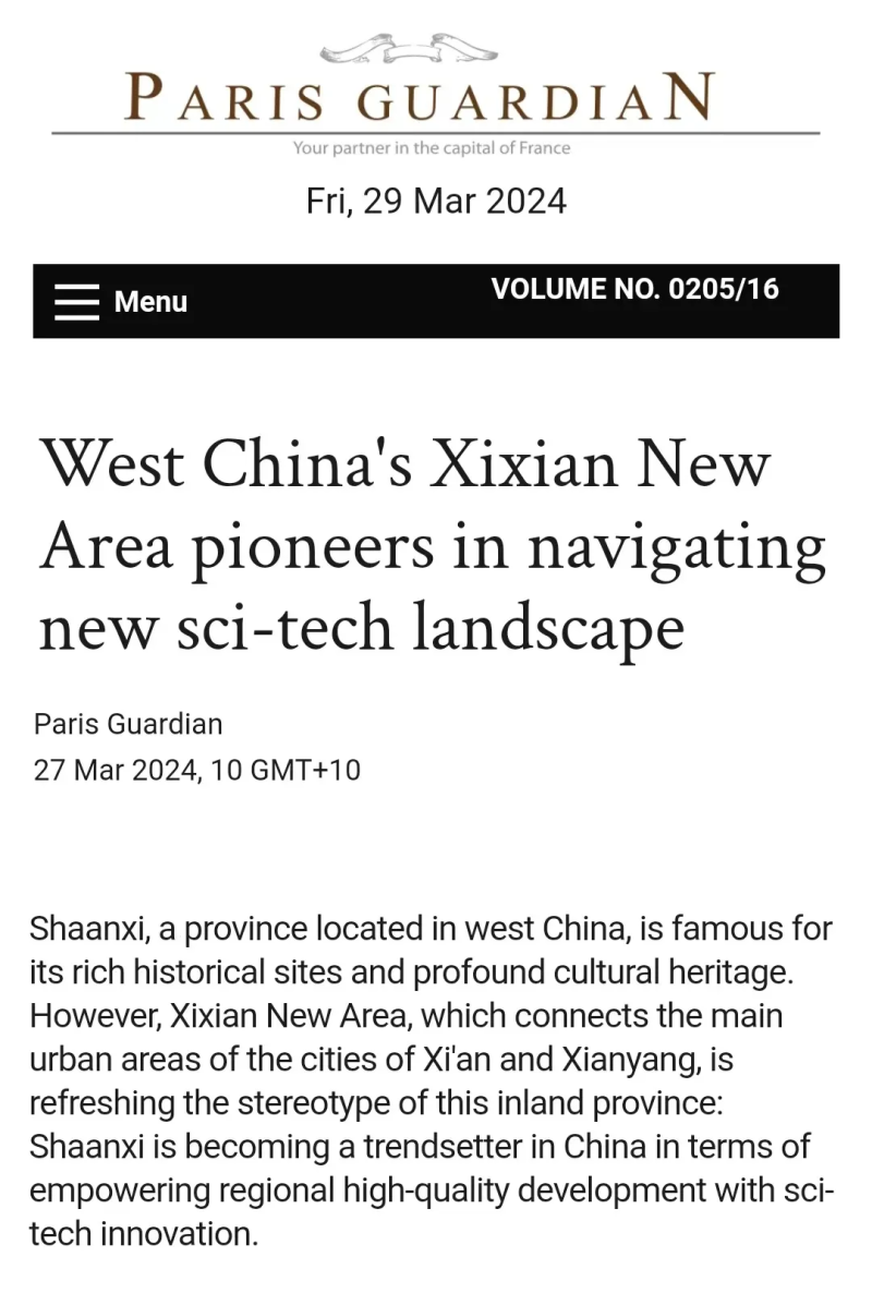 全球通讯社联盟发布文章《West China's Xixian New Area pioneers in navigating new sci-tech landscape》(中国国家级新区西咸新区竞逐科技创新“新蓝海”),被全球510家外媒转载,截至目前,总浏览量超3亿人次。