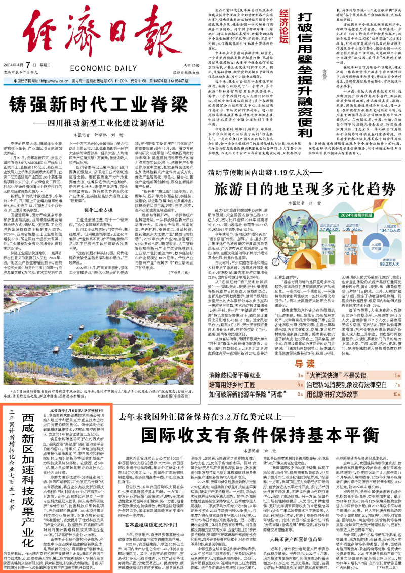 4月7日,经济日报头版刊发《西咸新区加速科技成果产业化》聚焦新区作为秦创原总窗口深掘科教资源优势,以科技创新激发产业创新奋力跑出新质生产力发展加速度。