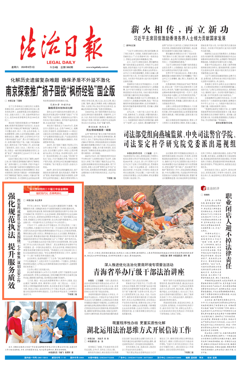 8月3日,法治日报头版刊发《强化规范执法 提升服务质效西安西咸新区公安机关围绕“七个聚焦”谋划公安工作》聚焦新区法治化营商环境畅通“护企安商”服务渠道,全文如下。