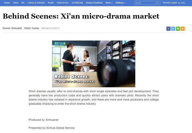 近日,由新华网海外社交媒体传播中心、新华网陕西频道联合制作,新华网、新华社陕西分社新华社国际传播平台联合出品的《探班爆火全网的微短剧片场》在新华网首页刊发,英文版同步上线,聚焦西咸新区影视微短剧基地,挖掘爆火微短剧背后的故事。