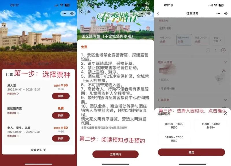 本次免费开放时间为4月2日-4月30日,开放范围仅限酒庄户外园区,主城堡内参观体验需单独购票,大家可根据需求自行选择。