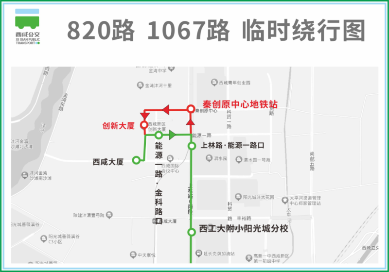 原820路、1067路西咸大厦方向,上林路-能源-路段临时调整为上林路-能源二路。820路西咸大厦至邓家村、1067路西咸大厦至翱翔小镇地铁站方向保持不变。