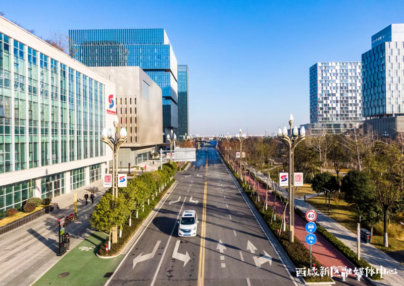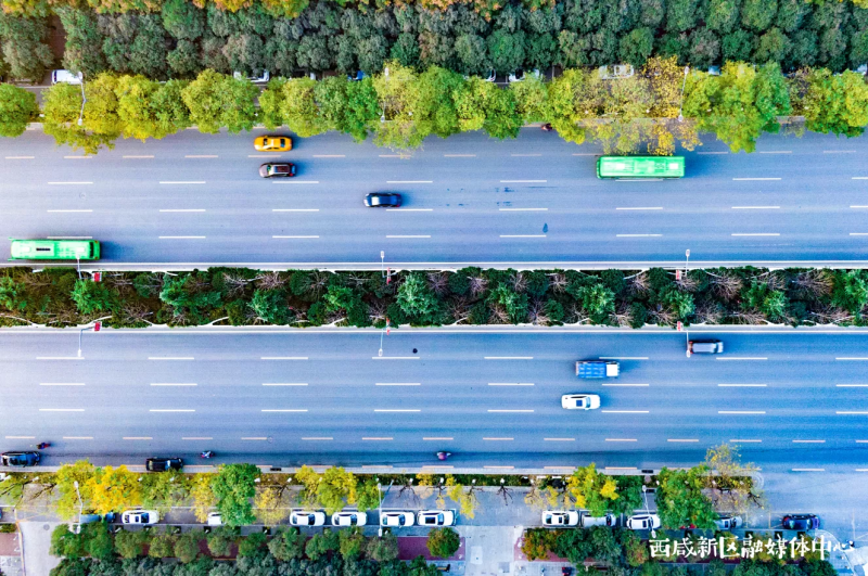 车辆川流不息,高楼鳞次栉比,西咸新区沣东新城的三桥新街已然成为大西安的交通主动脉,车道中央的绿化带和两侧的绿化分隔带让这里在冬日也毫不萧瑟。