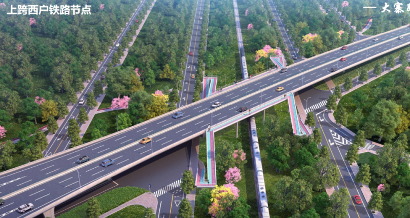 在绕城高速东侧布置一对平行匝道,便于两侧路网沟通;在西户铁路处增加布置一对平行匝道,供西户铁路两侧地面机动车及慢行系统跨越西户铁路。同时在跨越绕城高速、阿房宫车辆段、西户铁路三处增设慢行系统天桥。雨污水、照明、交通、绿化等工程同步设计。