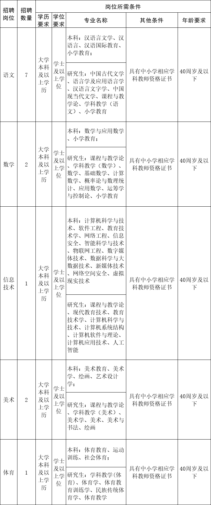 本次招聘涉及语文、数学、体育、信息技术、美术5个学科,计划招聘13人,均为专任教师。