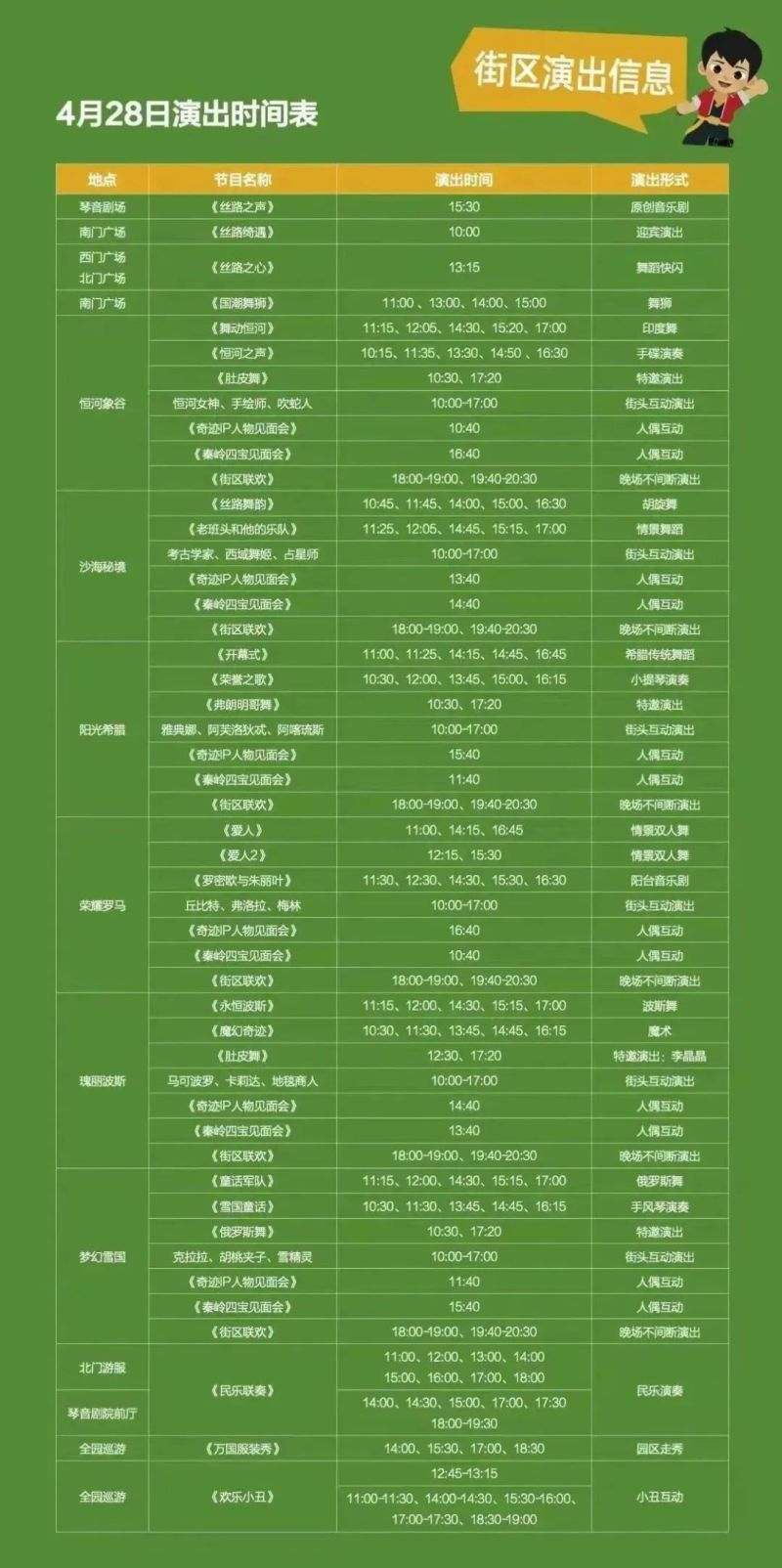 4月28日起,在丝路欢乐世界的南门广场、西门广场、北门广场以及各主题街区,每日都有精彩节目为您呈现,人偶互动、舞蹈快闪、魔术等接连不断,园区每日将推出不同的表演节目给大家带来不一样的视听体验。
