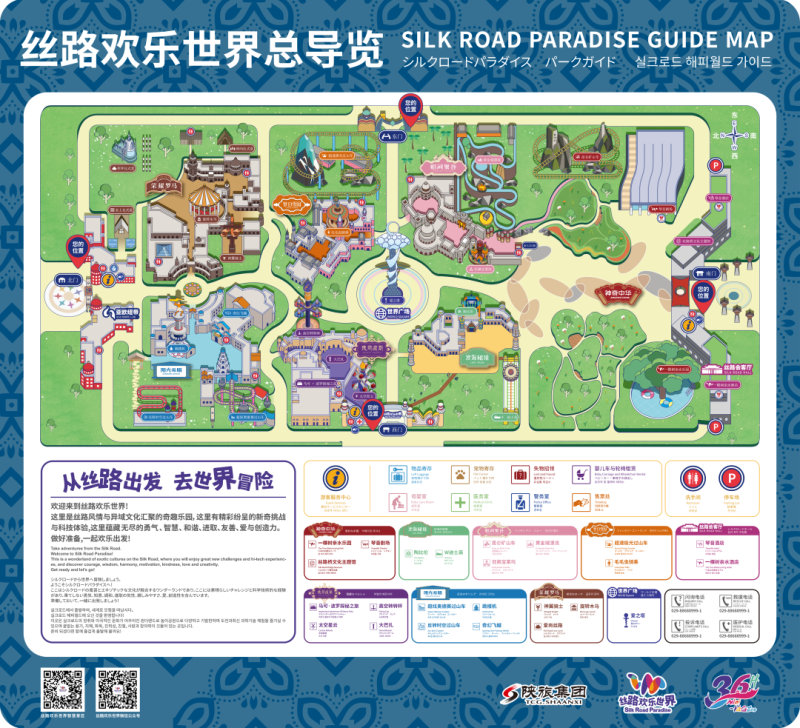 丝路欢乐世界分为七大丝路文化主题街区,每个街区导视牌都有明确标识,您可根据标识进行游览也可查看下方园区导览图选择下一站。