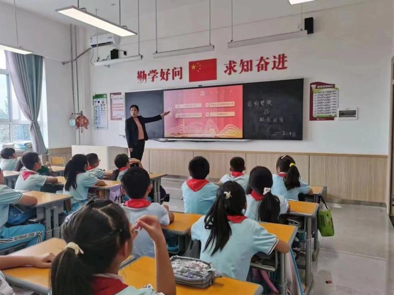 少年强则国强,学生认真聆听老师讲述国庆节的相关知识,深入了解新中国的光辉历程,弘扬民族精神,增强自豪感和责任感。