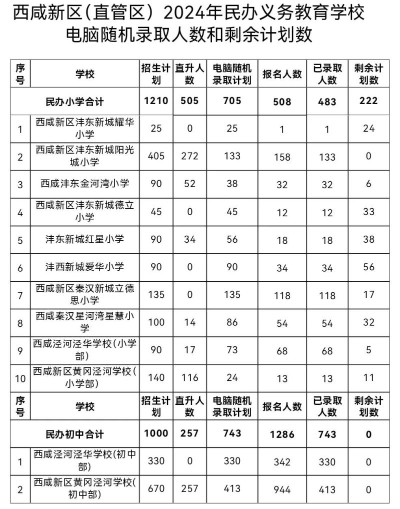 西咸新区(直管区)2024年民办义务教育学校电脑随机录取人数和剩余计划数