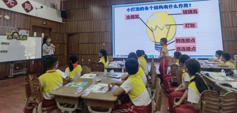 在专题培训研讨环节,空港阳光里小学李亦婧老师的展示课《点亮小灯泡》,巧妙运用电池、导线、小灯泡及试验记录单等材料,让学生在轻松愉快的氛围中探究小灯泡发亮的奥秘。