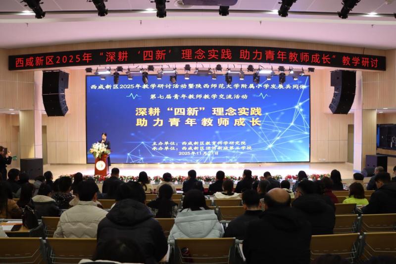 11月27日,西咸新区2025年“深耕‘四新’理念实践 助力青年教师成长”教学研讨活动暨陕西师范大学附属小学发展共同体第七届青年教师教学交流活动在西咸新区泾河第三学校举行。西咸新区教科院负责人李宏、陕西师范大学附属小学副校长何军华、西安文理学院小学教育系主任闫成海及西咸新区兼职教研员、骨干教师及共同体青年教师代表共140余人参加。