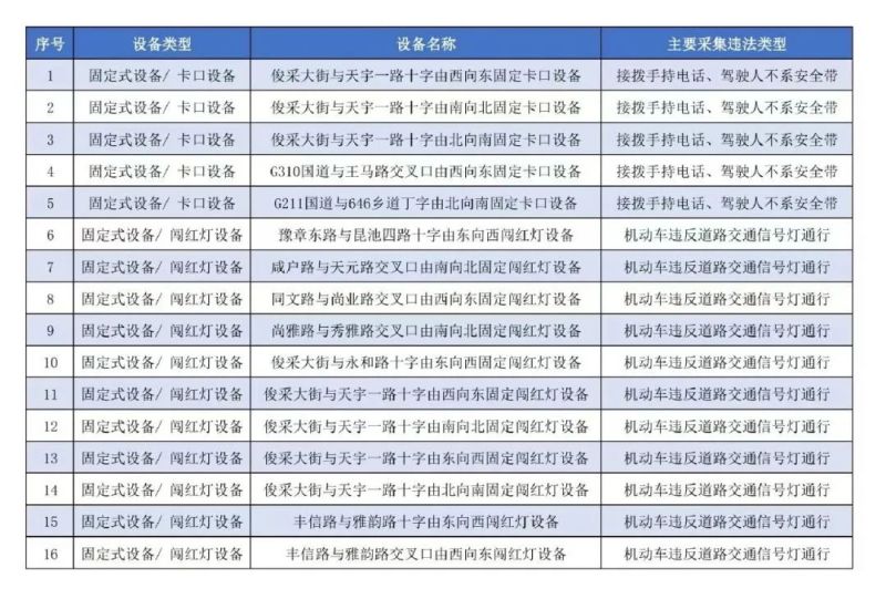 凡在上述点位,有驾驶机动车违反道路交通信号通行、违反禁止标线指示、逆向行驶、不按导向车道行驶、柴油货车违反禁令标志驶入禁行区域、未按规定使用安全带以及驾驶人接拨手持电话等交通违法行为的,将按照《中华人民共和国道路交通安全法》等相关规定予以处罚。