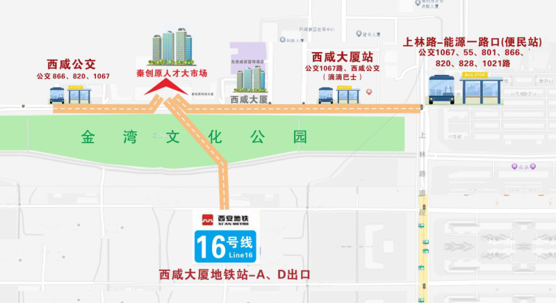 方式一:西安地铁16号线“西咸大厦”站A/D口出,步行至“西咸大厦”楼宇西侧100米即到