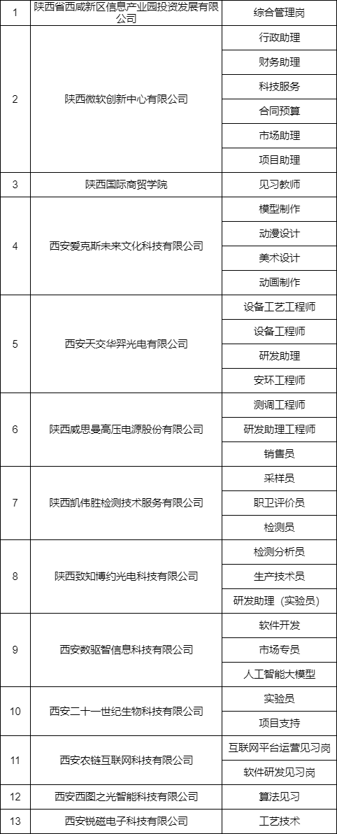 为保障企业用工,强化人才储备,提升高校毕业生和失业青年就业技能,现将沣西新城就业见习岗位需求进行公布,共31家单位116个岗位